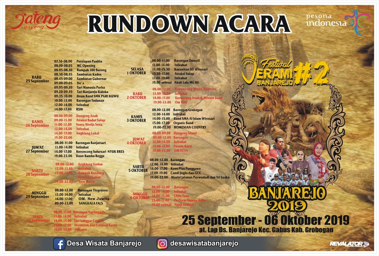 Festival ini akan dilangsungkan di lapangan Desa Banjarejo, Kecamatan Gabus, Kabupaten Grobogan. Berbagai macam rangkaian acara mulai dari Diorama Jerami, Pertunjukan Karya Seni, Batik Carnival, dan Ngaji Budaya. Festival ini, akan dimeriahkan oleh Abah Lala (Cendol Dawet), Tami Aulia, Musisi Jogja Project, Seni Reog dan Barongan serta Festival Band.